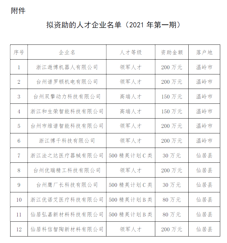 附件:拟资助的人才企业名单(2021年第一期)